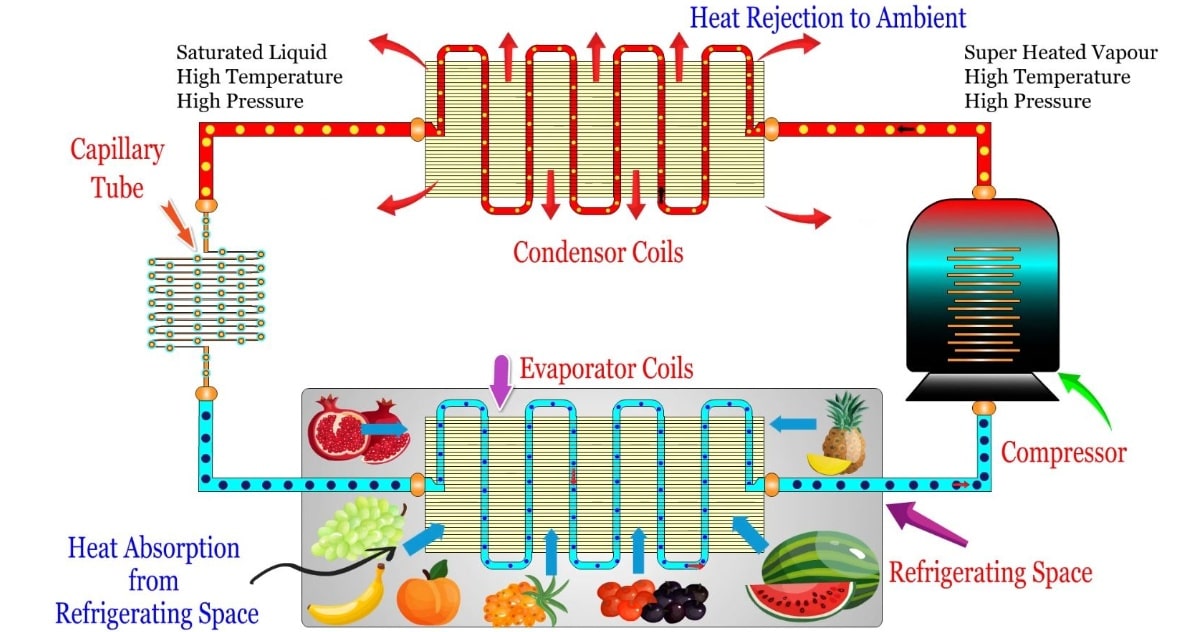 The vast majority of refrigerators operate on the vapor compression principle. Compressor, condenser, expansion unit, and evaporator are the four essential components of a modern refrigeration system. A volatile fluid (refrigerant fluid) circulates through the refrigeration system, where it is converted into liquid and vapor forms on a regular basis.