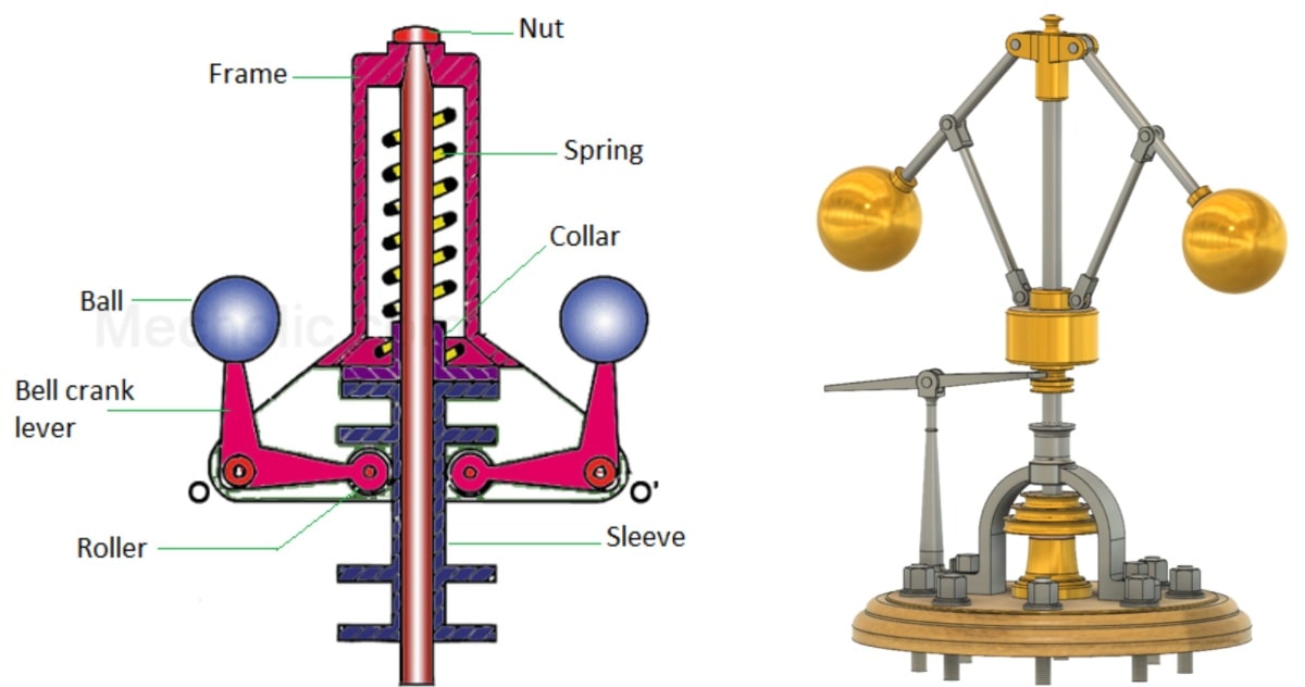 It is simplest and the gravity controlled type of centrifugal governor. In this governor, there are two fly balls attached to the sleeve which has a negligible mass. In some places it is also defined as a pendulum type centrifugal governor. Upper end of the arms attached to the balls is pivoted, enabling the balls to move up and down during the revolution. Lower ends of the lower arms are connected to the sleeve, which too rotates along with the spindle. At the same time it can slide up and down along the spindle too. Spindle is driven by the engine via bevel gears. The speed of the engine increases with decrease in load on it. This increase causes an increase in the revolution speed of the spindle, thus the governor balls tend to move outward and the sleeve moves upward. This in turn closes the throttle valve linked to the sleeve via bell crank lever and the fuel supply to the engine decreases and thus its speed decreases too.
